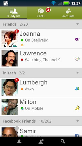 ₪₪ Instant mesge, chat, & IM AIM, Yahoo, ICQ, GTalk, Mpace, Jabber, Facebook, MSN (Windows Live Messenger WLM). BeejiveIM an IM allows chat / instant mesge IM buddies anywhere go! Chat AIM, Yahoo, ICQ, GTalk, Mpace, Jabber, Facebook, MSN (Windows Live Messenger WLM). ₪₪ Beejive's reliable efficient network has tested proven mulple platms. Move from cellular wifi connections seamlessly. Stay connected after close lication be notified when get a mesge through push notifications (OS 2.2+). After be of coverage BeejiveIM aomatily reconnects picks up where left off. ₪₪ BeejiveIM uses phone's exist data plan wifi connection, ve money by reduc t mesges. ₪₪ Key Features: ₪₪ BeejiveIM uses exist data plan: no per-mesge charges. ₪₪ Reliable efficient network: be connected 24/7, i gentle battery. ₪₪ Be connected even after close lication. Get notified instantly when get a mesge Push Notifications (OS 2.2+). ₪₪ Works mulple IM networks, mulple accounts per network: AIM®/iChat, MSN®, Yahoo!®, GoogleTalk®, Facebook IM, Jabber, Mpace IM. ₪₪ Send receive files, includ pictures voice notes. View ward received documents. ₪₪ Desktop- instant mesg of IM buddies from a sle intuitive user interface. ₪₪ Chatng Features: ₪₪ Real- chats: quick switch beten mulple simultaneous chats. ₪₪ Group chats: chat mulple buddies AIM, Yahoo, GTalk, MSN. ₪₪ Full Unicode support, chat any language supported by Android device. ₪₪ Landscape option, type a larger keyboard. ₪₪ Chat tory: Email chat logs ve chat tory. ₪₪ Hyperlink support, aomatily parses links b pages, Yube videos, email addresses, twitter usernames, phone numbers. ₪₪ Emoticons support. ₪₪ SMS , chat SMS buddies through AIM Yahoo SMS . ₪₪ Account & Buddy Features: ₪₪ Manage buddy-list, includ /remove, nicknames, groups, block, rove/deny requests. ₪₪ Sort/group/search buddy list. ₪₪ Control own availability, set ao-away custom status mesges, be invisible, change privacy ntrols. ₪₪ Configurable alerts, customizable sound, vibrate setngs. ₪₪ Buddy icon support, view ' icons, set own. ₪₪ 's t version : (Updated : Sep 17, 2012 ) ₪₪ interface tablets! ₪₪ Various bug fixes & enhancements ₪₪ version 4! ₪₪ br spank design! ₪₪ added buddy online alerts (buddy pounce) ₪₪ SMS style t inp chats ₪₪ added sound vibration alerts setngs ₪₪ improved view of file transfer files ₪₪ compact buddy list option ₪₪ ton of bug fixes & stability improvements! ₪₪ Required Android O/S : 2.1+ ₪₪ ₪₪